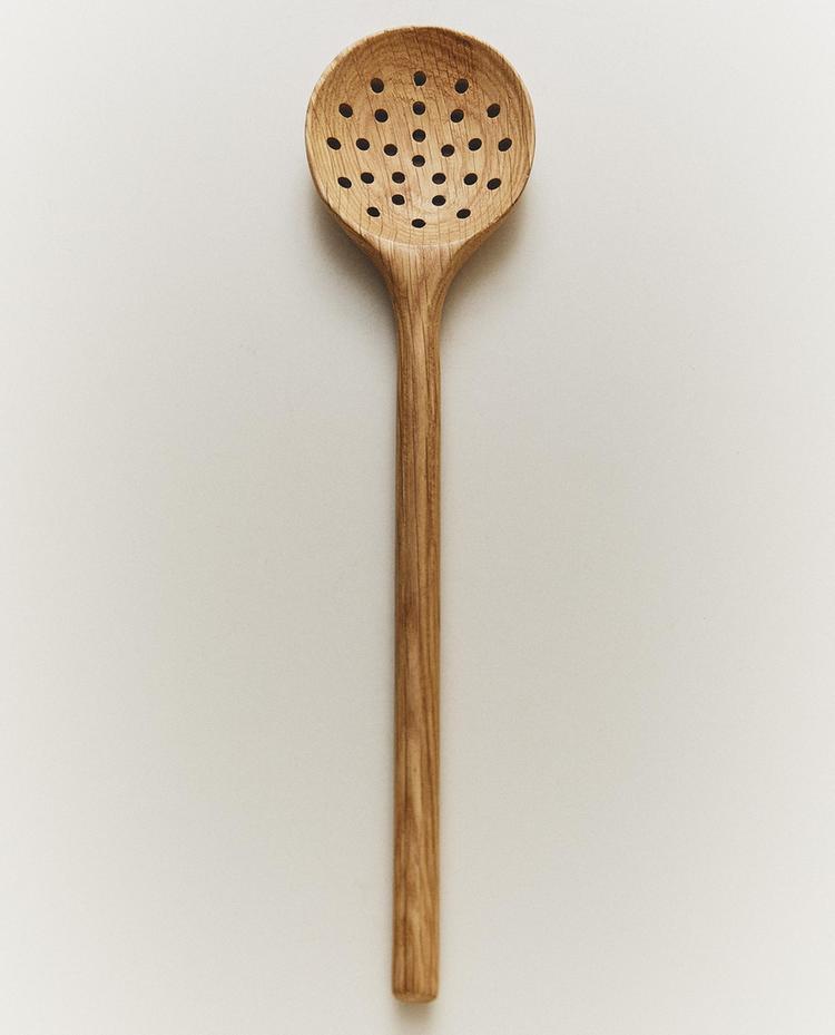 Кухонная шумовка из дуба с перфорированной головкой и длинной ручкой, предназначенная для легкого зачерпывания и слива, сохраняя комфортное расстояние от жара.