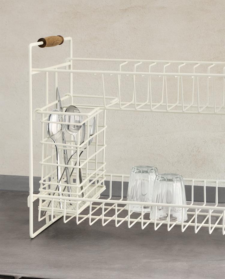 Двухъярусная сушилка для посуды из лакированного металла. Оснащена двумя ручками из дерева по бокам и различными отделениями для стаканов, столовых приборов и тарелок.