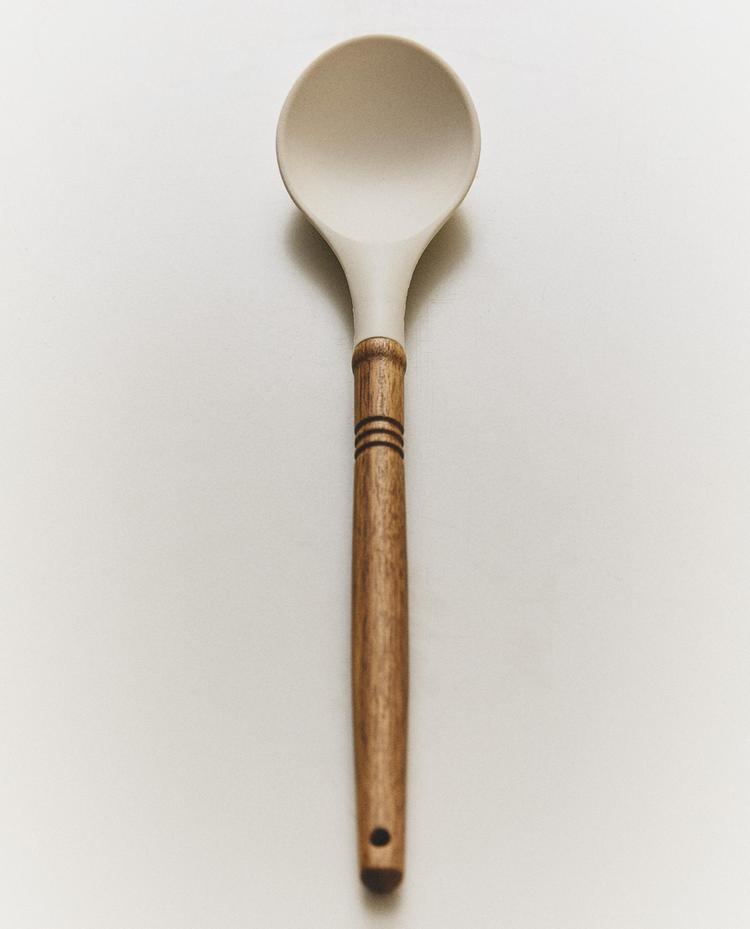 مغرفة سيليكون بمقبض من خشب السنط. غير مناسبة لغسالات الأطباق. نظراً لأنها منتج خشبي، فقد يختلف لونها وشكلها. يمكن الحفاظ على الخشب باستخدام الزيت النباتي.