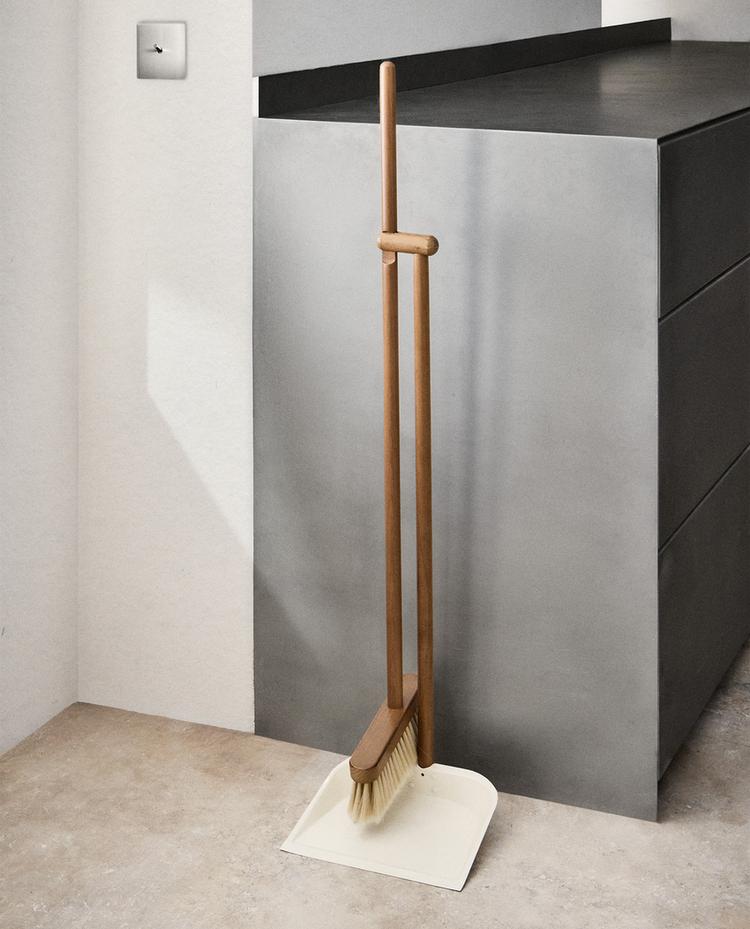 Wooden dustpan and brush set with acrylic bristles and a beech wood handle. Lacquered metal dustpan. The brush can hook onto the dustpan handle in two different positions to adapt to any storage space.