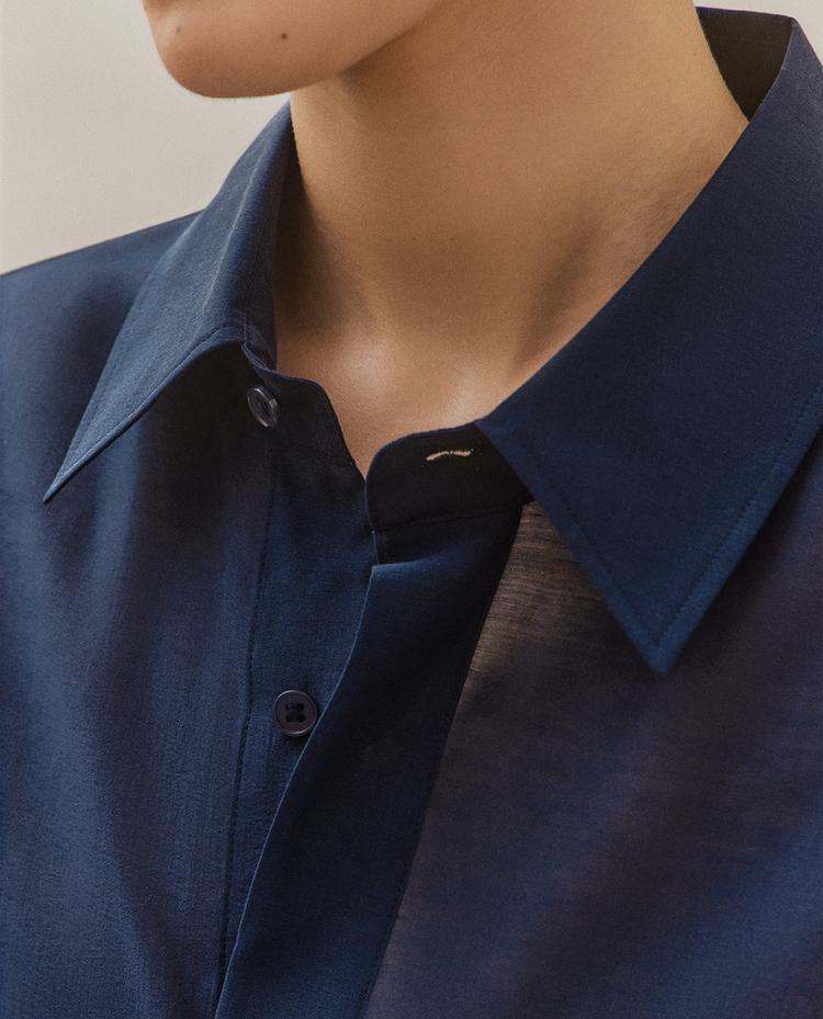 Iš dalies permatomi dukslūs marškiniai, pagaminti iš lengvo lengvo audinio, su plazdančiu apdaila, klasikinė apykakle ir ilgomis rankovėmis.