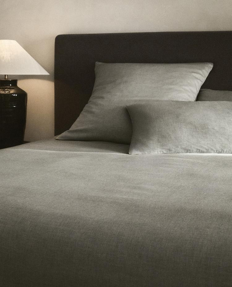 Housse de couette confectionnée en coton avec un tissu chambray au design uni.