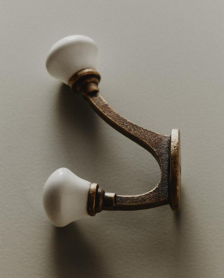 Metālisks sienas pakaramais ar diviem keramikas āķīšiem.