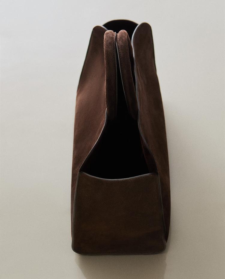Mini iepirkumu soma, kas izgatavota no ādas ar raupjas zamšādas apdari. Iekškabata ar rāvējslēdzēju. Rokturi.