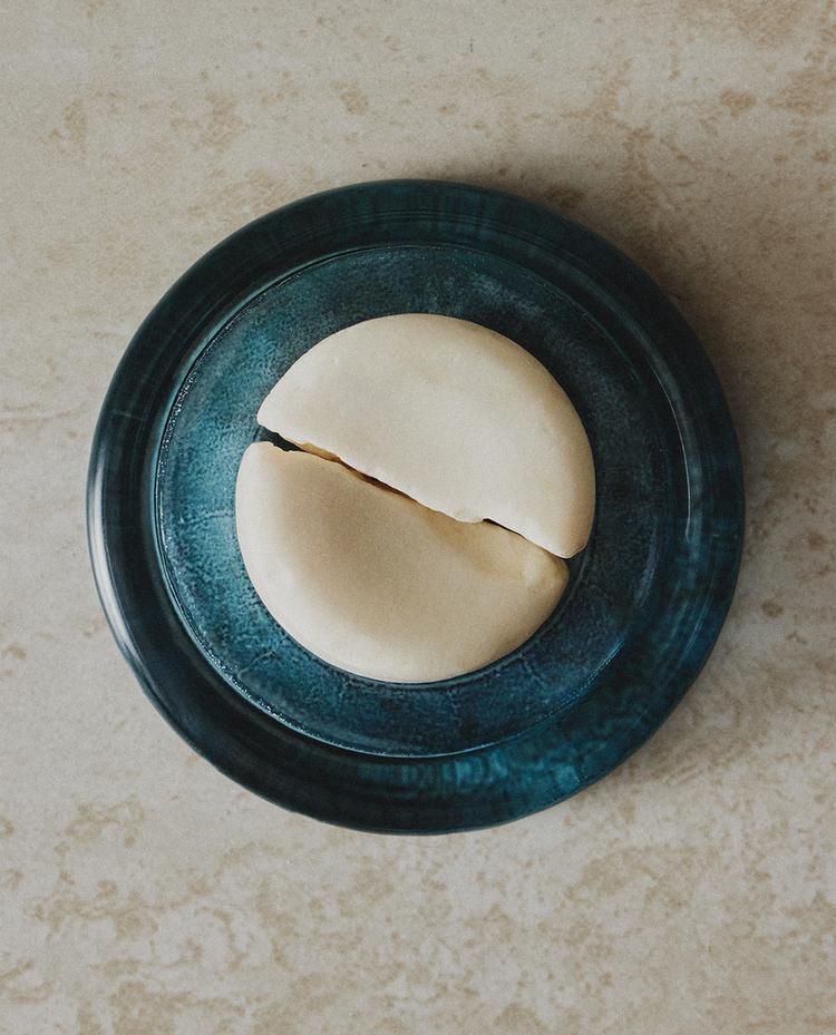 Vannas istabas ziepju trauks no zila caurspīdīga stikla ar apaļu dizainu, paaugstinātu malu un nedaudz ieliektu iekšējo virsmu ar gludu apdari.