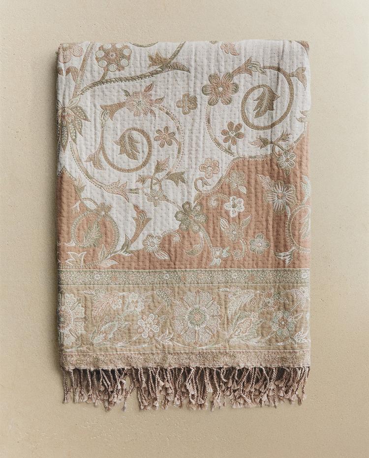 بطانية جاكار قطن بتصميم أزهار وشراشيب.