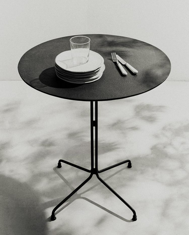 طاولة مستديرة بهيكل معدني وتصميم بسيط. مظهر أسود غير لامع، مثالي للاستخدام في المساحات الداخلية والخارجية.