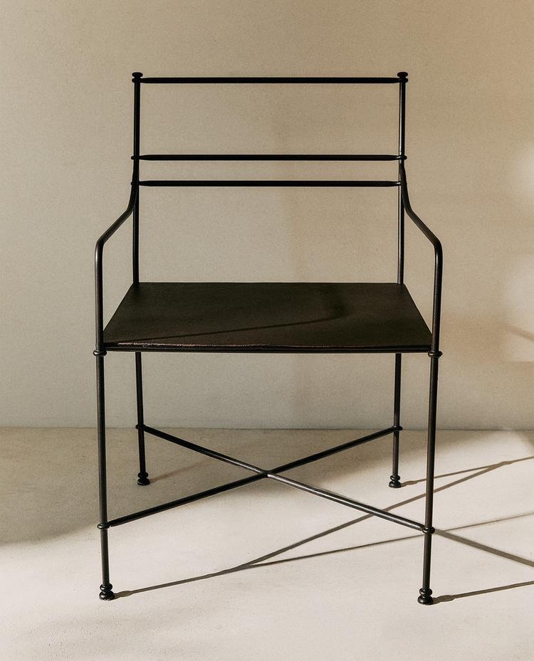 كرسي مميز بمساند للذراعين مصنوعة من المعدن المطروق. يمتاز بمقعدة كبيرة ومسند ظهر مائل. مظهر أسود عديم اللمعة، مثالي للاستخدام الداخلي أو الاستخدام الخارجي.