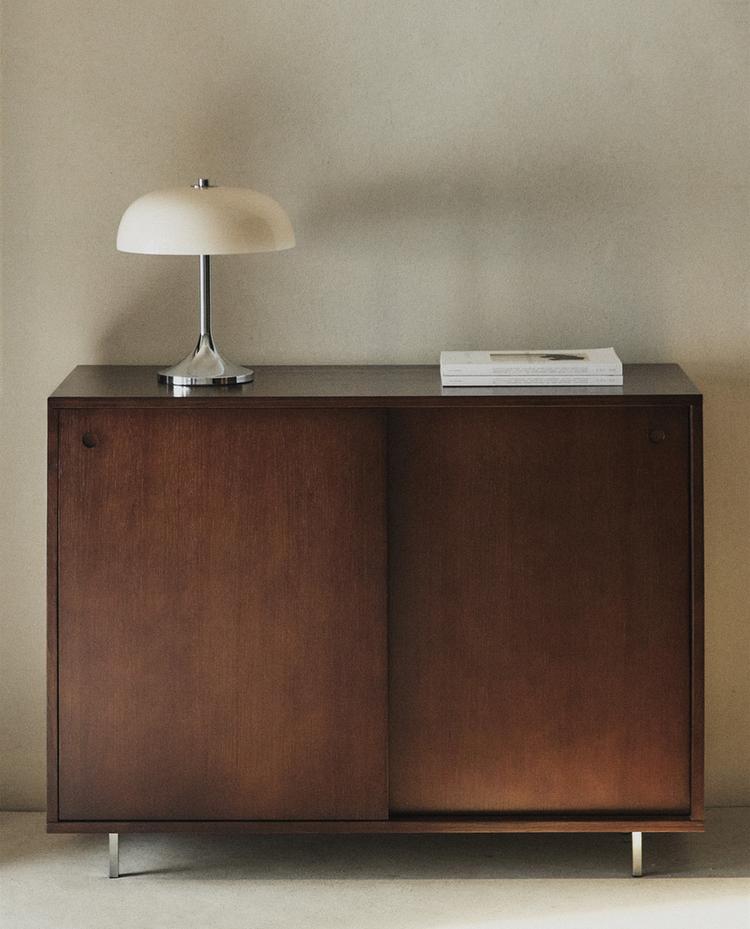 وحدة تخزين خشب بأبواب منزلقة، رف داخلي وأرجل معدنية.