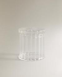 إناء منظم للحمام من زجاج البوروسيليكات 229 MADشفاف|2523/455/990إناء منظم مستدير شفاف للحمام من زجاج البوروسيليكات بتصميم بارز وغطاء.إضافة