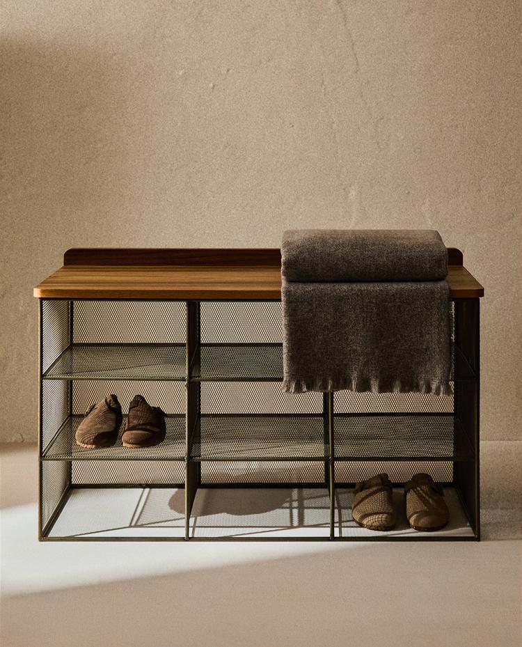 Banquette range-chaussures avec structure en résille de fer et 9 compartiments de rangement. Comprend un plateau en bois d'acacia sur le dessus qui permet de l'utiliser également comme siège.