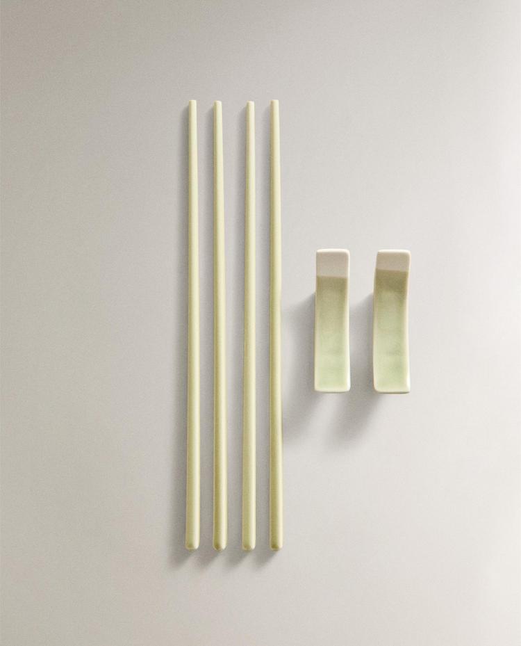 SET OF CERAMIC CHOPSTICKS AND HOLDER (SET OF 2) 499 MADGREEN|6204/311/914Set of ceramic chopsticks with a horizontal design.The set includes four chopsticks and two holders.HeightWidthDepth7 cm24.50 cm3 cm499 MADEnter quantity of units to purchase Quantity updated to 1 units Measurement guideAdd 499 MAD