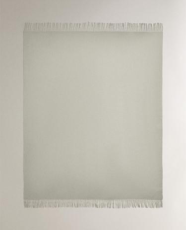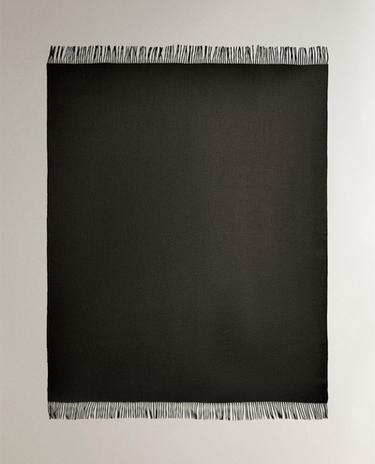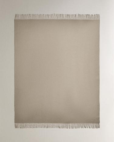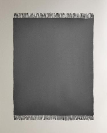 Warm and lightweight throw made of plain-coloured fabric with fringing at the ends.
