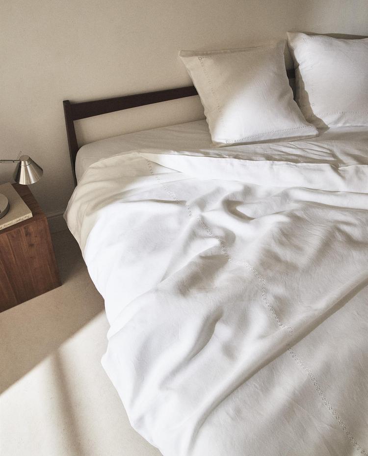 Housse de couette confectionnée en lin avec un détail de jour échelle sur le bord.