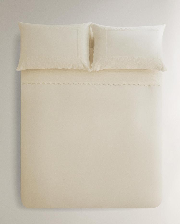 Couette en percale de coton 200 fils avec broderie décorative et détail ajouré sur le bord.
