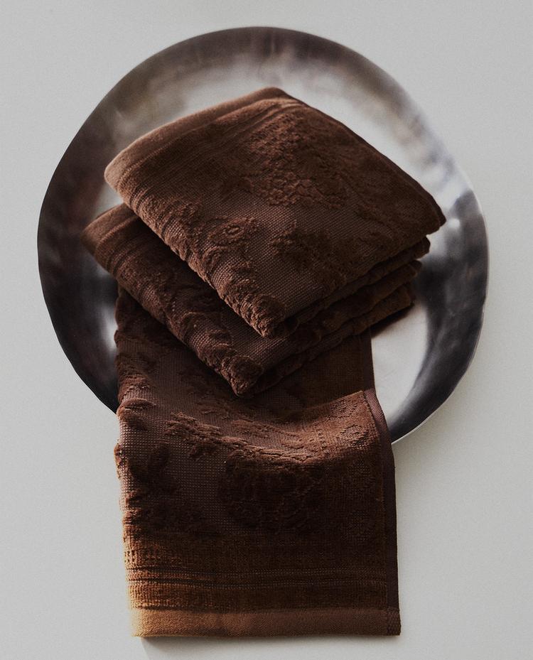 Serviette invité en velours de coton avec jacquard floral. Le lot comprend 3 unités.