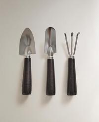 Set of garden tools including a rake, narrow shovel with a rounded tip and a wide pointed blade and a wide, pointed shovel. Made of steel with beech wood handles.