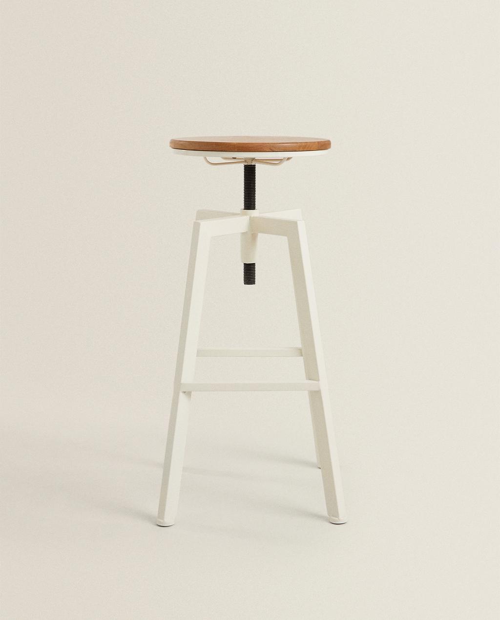 Swivel bar stool with wooden seat and retro-style lacquered metal structure. The height of the seat is adjustable, reaching 76 cm in its highest position and dropping to 60 cm in its lowest position.