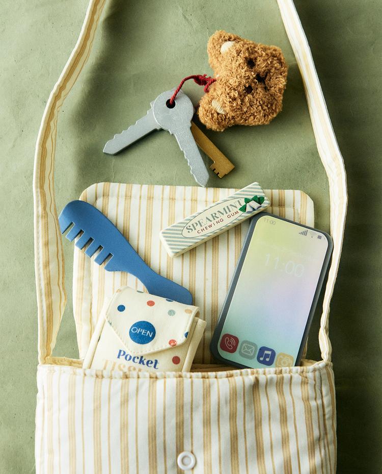 L'ensemble comprend un sac rayé avec une sangle et la phrase "My tiny bag", ainsi qu'un téléphone jouet, un peigne, des chewing-gums, des mouchoirs, une carte, des clés et un porte-clés avec un pendentif ours.