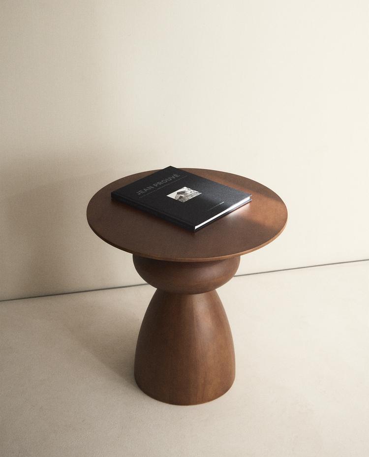 Table d’appoint ou table de chevet en bois, avec une base aux formes géométriques et un plateau rond.