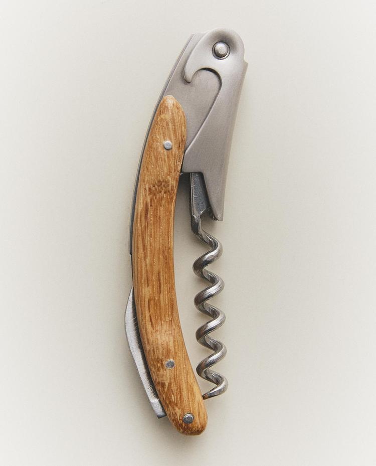 Tire-bouchon avec structure en acier et manche en bois de chêne, avec système d'ouverture pliable. Contient un petit couteau, un décapsuleur et le tire-bouchon.