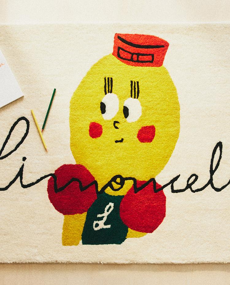 Kids' rectangular wool rug with a stepped and central Limoncella x The Animals Observatory motif.