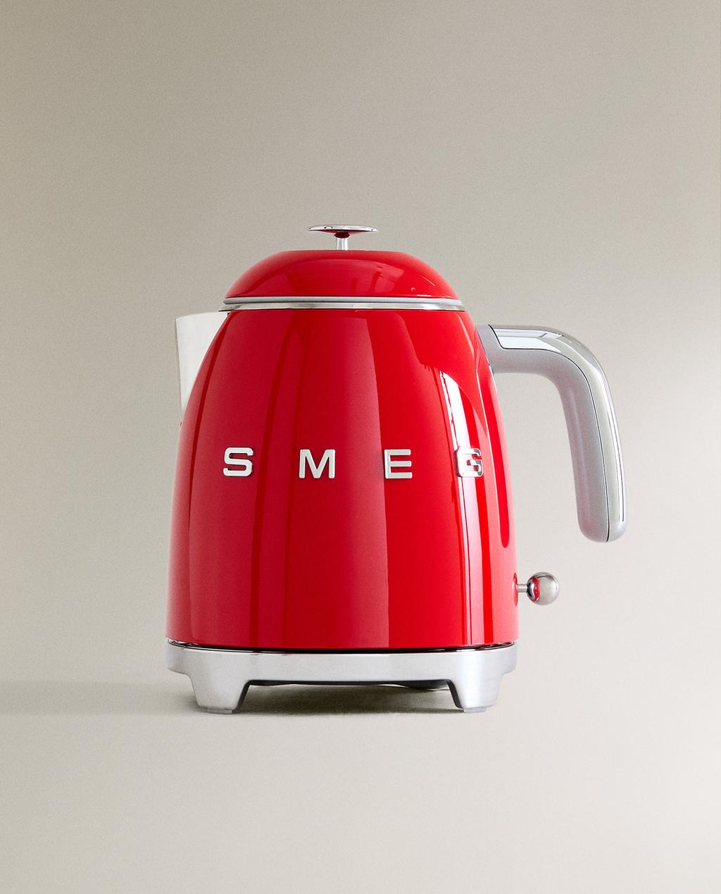 SMEG kettle with heat retention and a rotating base with non-slip feet. It has a steel frame and a stainless steel filter holder. 1950s style. Power: 1400 W. Maximum capacity: 0.8 litres (3 cups). Cable length (including storage compartment): 1 m.