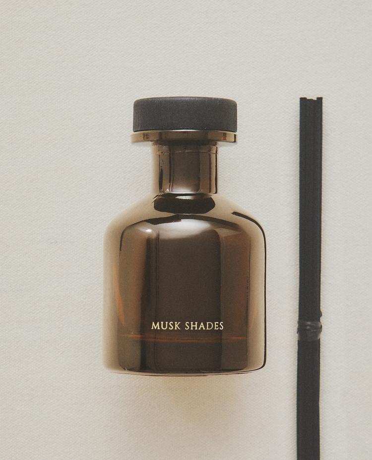 Musk Shades | La transparencia del almizcle refleja una fragancia llena de inocencia y dulzura. La explosión de las notas cítricas y las hojas de té se abren ante una impecable aura floral de pétalos de jazmín y mimosa bañados por el sol. En el fondo permanece el almizcle ofreciendo una sensación de pureza inigualable.
