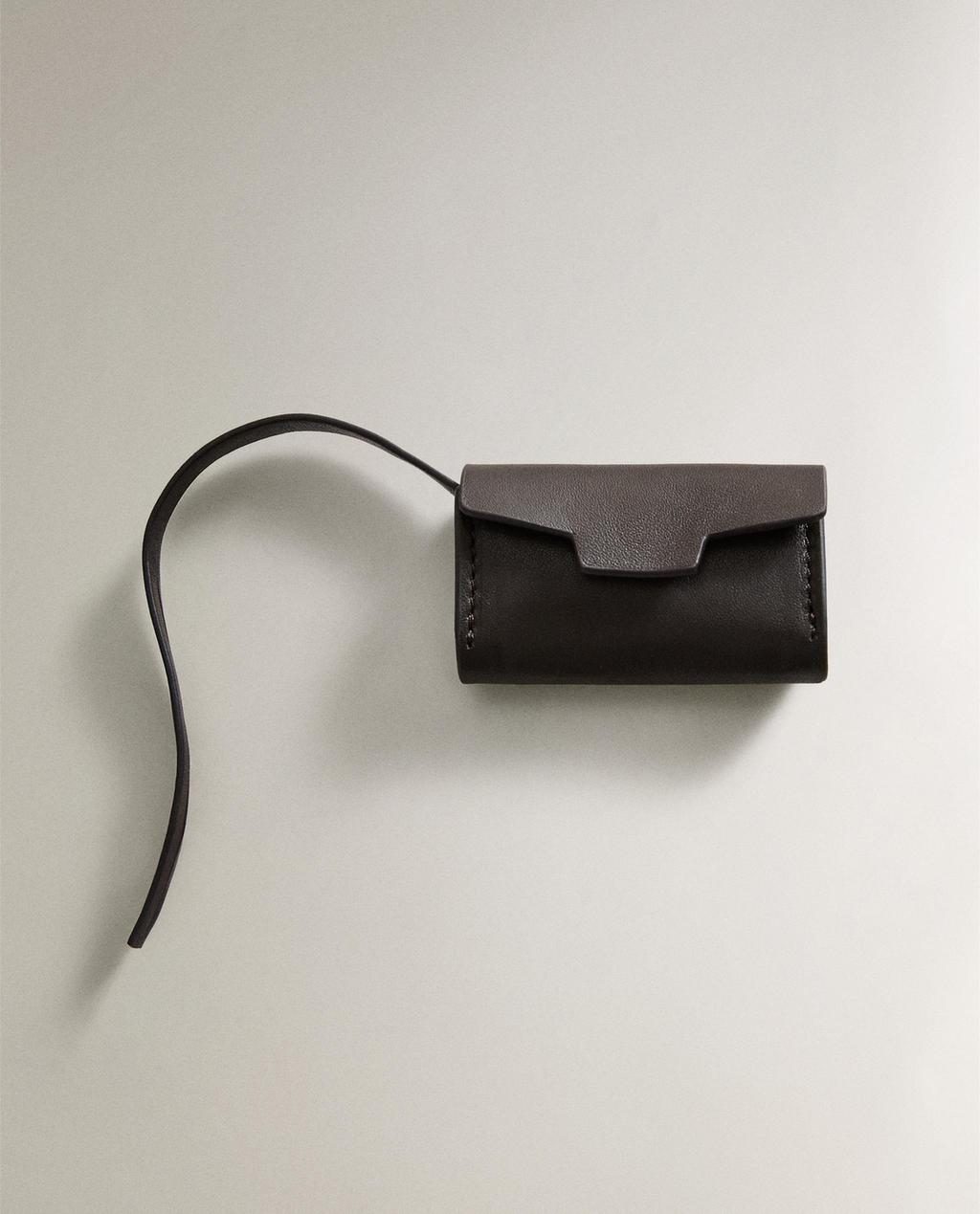 Dispensador de bolsas para mascotas confeccionado en piel con cierre de botón a presión. Diseño compacto con compartimento interior para alojar el rollo de bolsas y tira de piel para fijarlo fácilmente a la correa o al bolso.