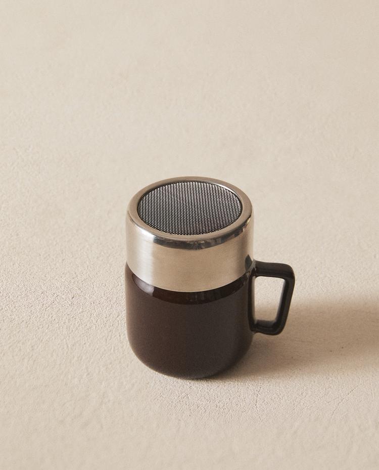 Espolvoreador o tamizador de cacao, canela u otras especias, para café, elaborado en gres y acero inoxidable con asa.