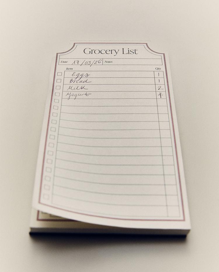 Lista de la compra con imán, formada por un bloc de hojas desprendibles en formato vertical. Presenta un diseño estructurado con líneas horizontales y casillas de verificación.