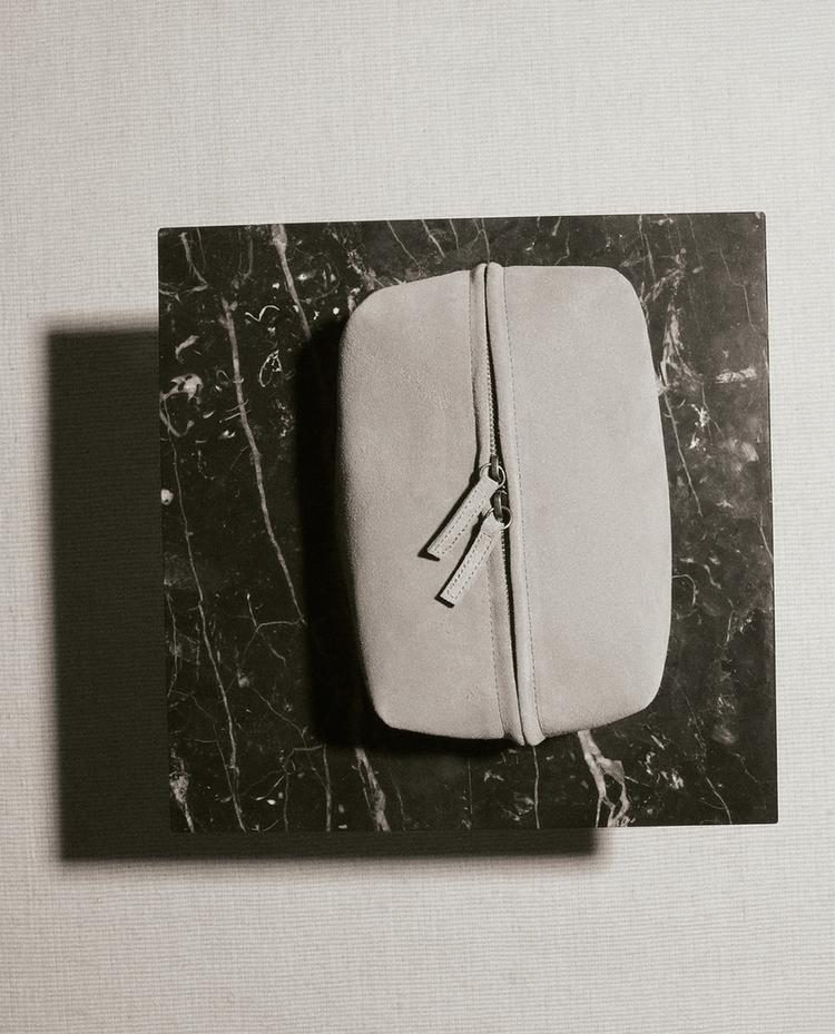 Neceser mediano de piel con acabado en serraje. Cierre mediante cremallera.