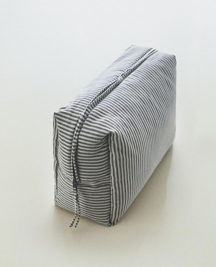 Neceser infantil confeccionado en algodón con diseño a rayas. Cierre de zipper y varios compartimentos en el interior.