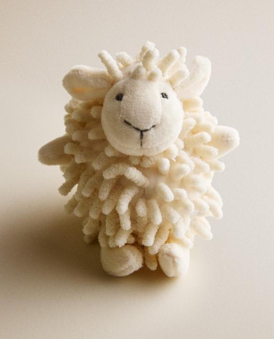 Sonajero infantil de peluche con forma de ovejita redonda con detalles bordados, orejas grandes y aplicaciones suaves que simulan la lana de la oveja.