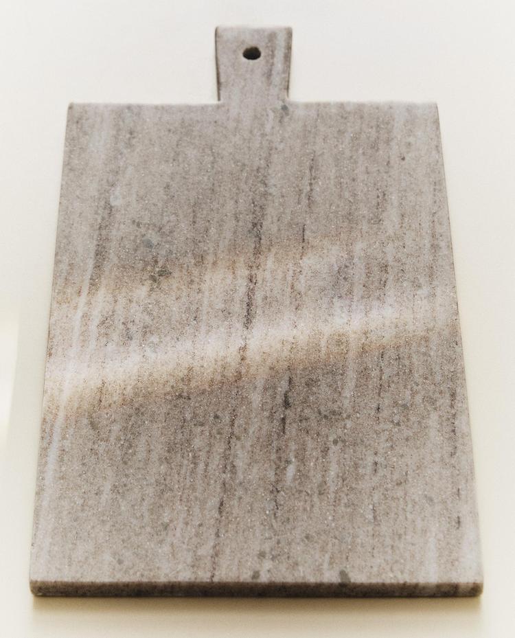 Tabla de cortar elaborada en mármol con forma rectangular y asa lateral.