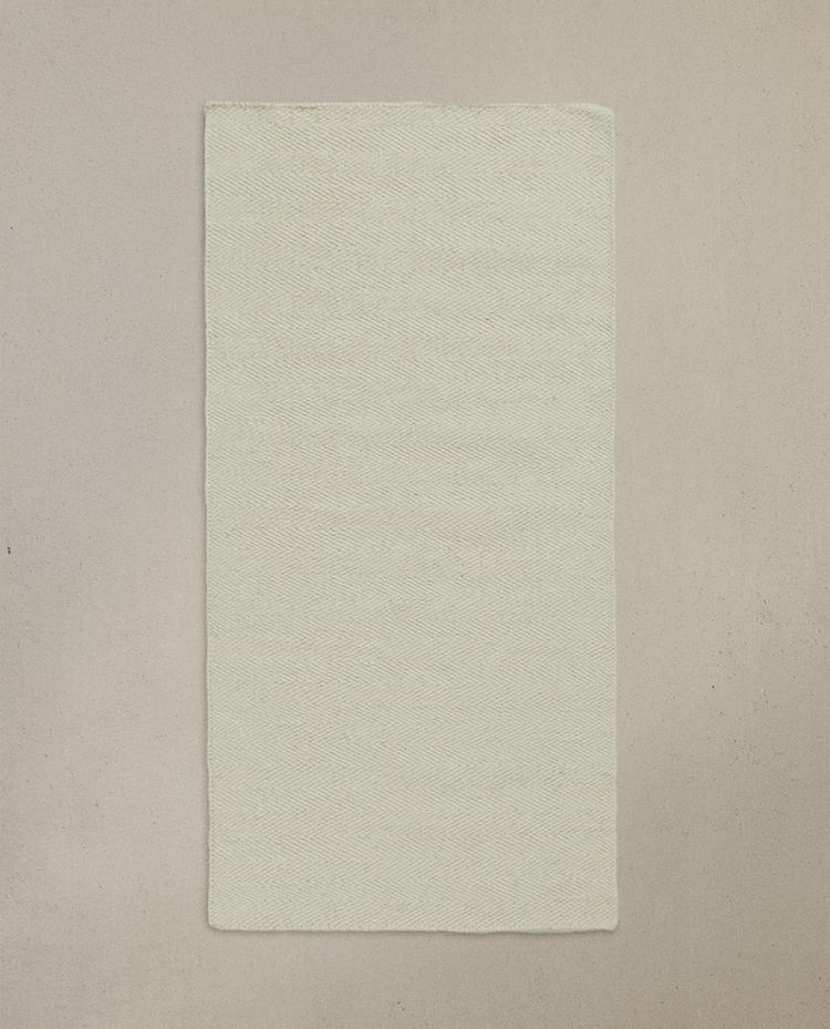 Tapete de lana y algodón, elaborado en telar siguiendo un patrón de espina de pescado. Disponible en tamaño para pasillo.