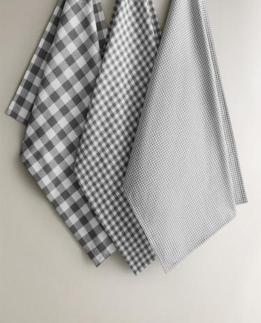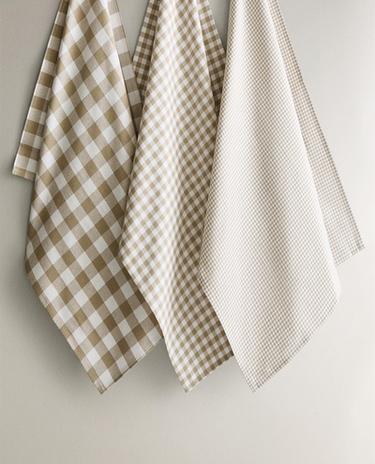 Katoenen theedoeken. Twee hebben een geruit motief met gekleurd garen en de andere heeft een effen design.