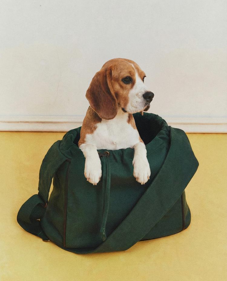 Pet carrier bag made of cotton with adjustable drawstring fastening and a long adjustable strap for greater comfort.