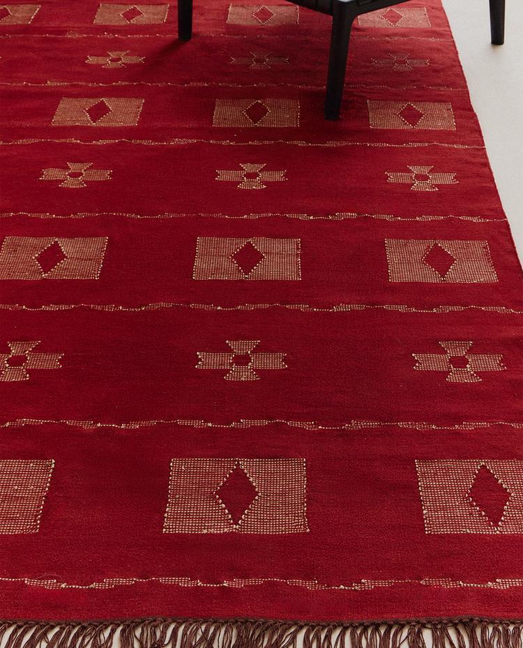 Wool and raffia rug with a geometric print. The design combines different shapes along the piece, adding texture and visual contrast.