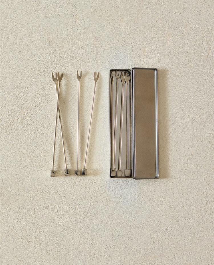 Set of aperitif picks with a metal box. Set includes 6 picks with forked tips and a cubic detail at the end of each handle and a rectangular metal box.