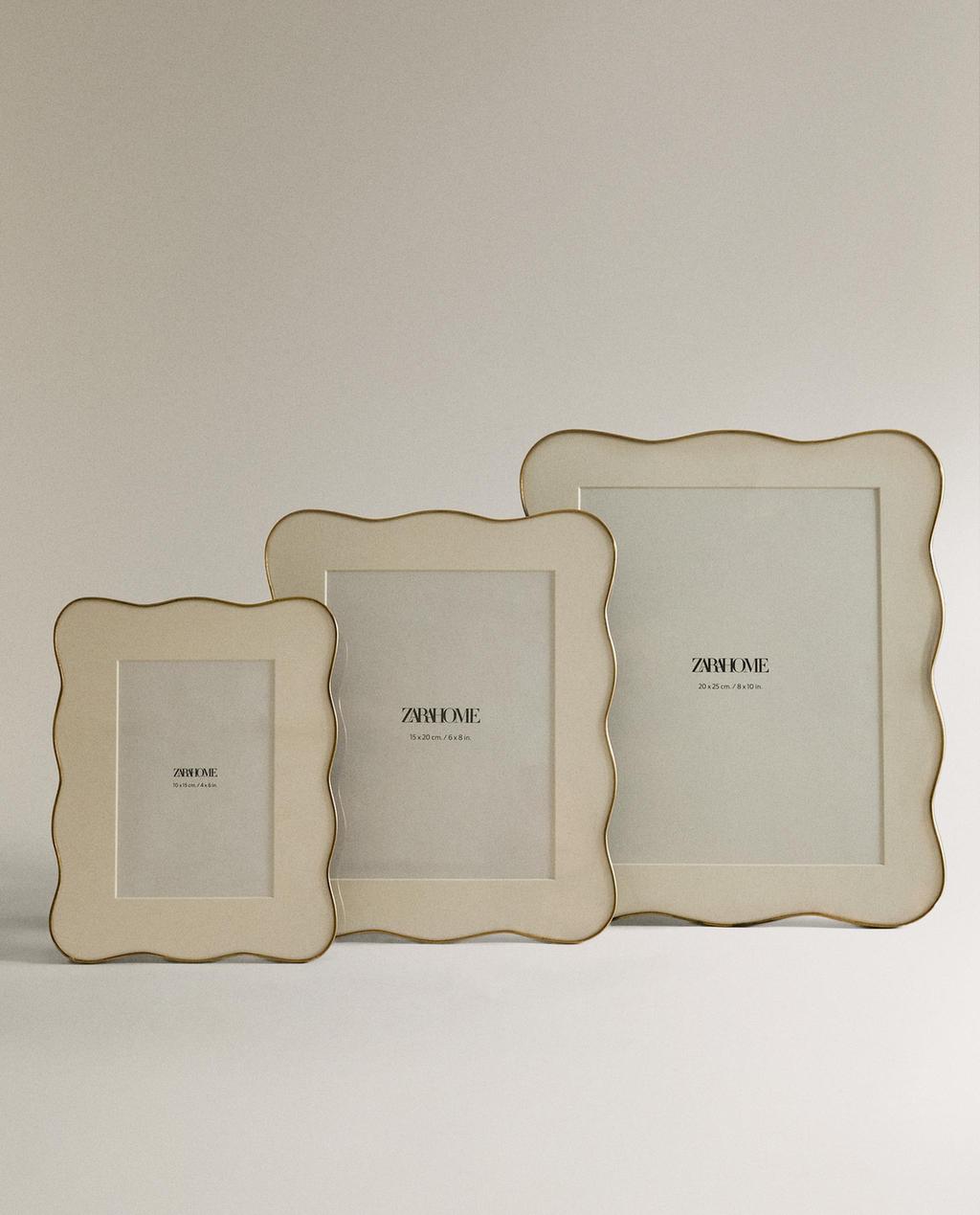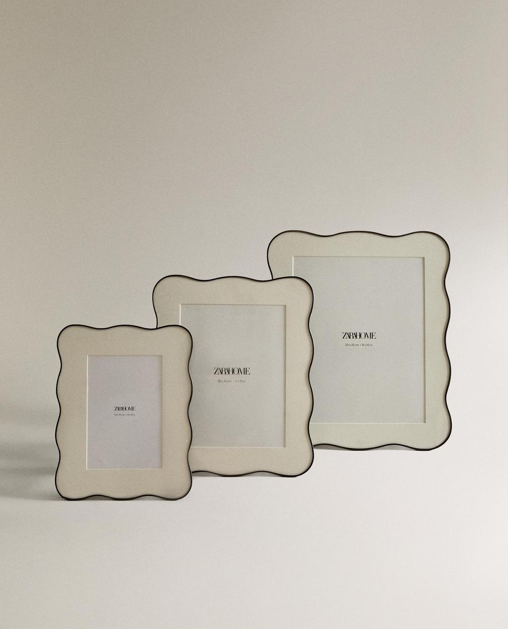 Fotolijst met een metalen rand en golvend silhouet. Kan verticaal en horizontaal worden geplaatst en aan de muur worden bevestigd met de mechanismen aan de achterzijde.