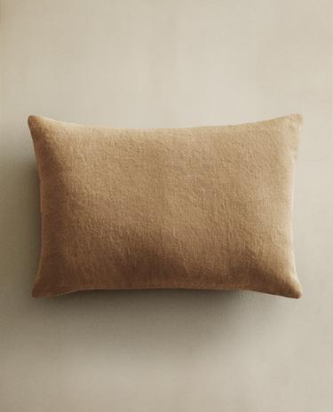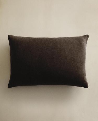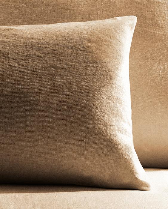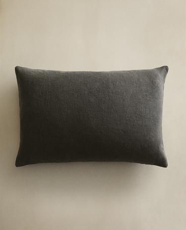 Kussenhoes gemaakt van verwassen linnen, met een verborgen ritssluiting aan de onderkant.