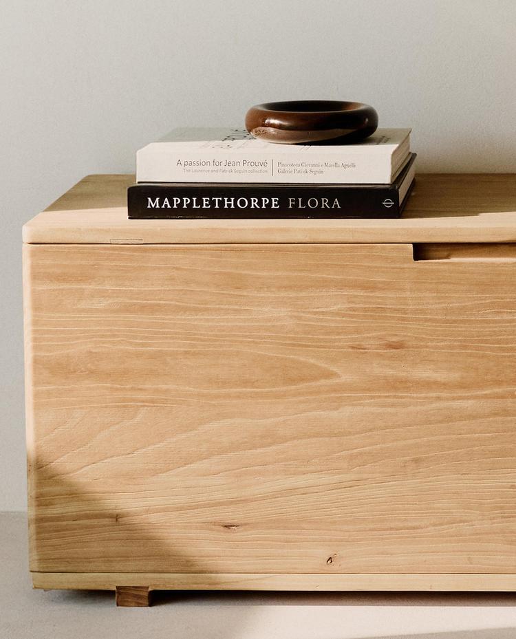 Elm wood chest with storage and a top door.