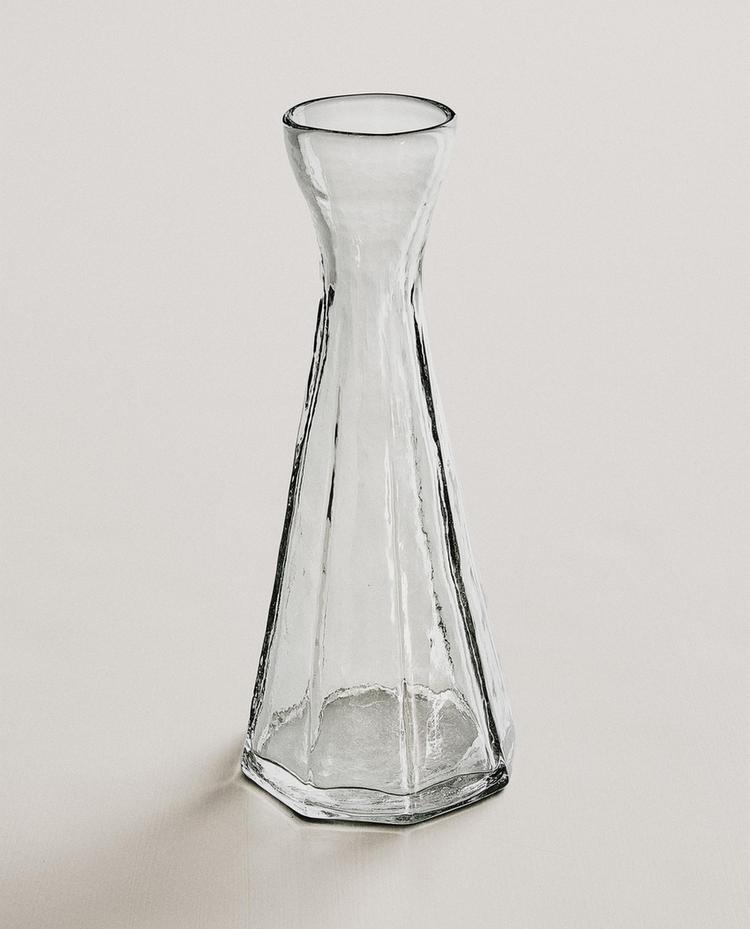 Glass vase. Faceted, elongated octagonal body that narrows at the top and a round neck that widens towards the edge.