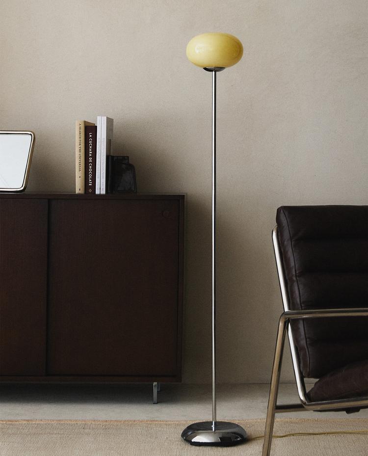 Floor lamp made of glass and metal. The design is characterised by a slender, minimalist structure, with a solid base that ensures stability. The lampshade has a spherical, slightly oval shape, evoking the appearance of a bubble, giving it a distinctive and contemporary look.