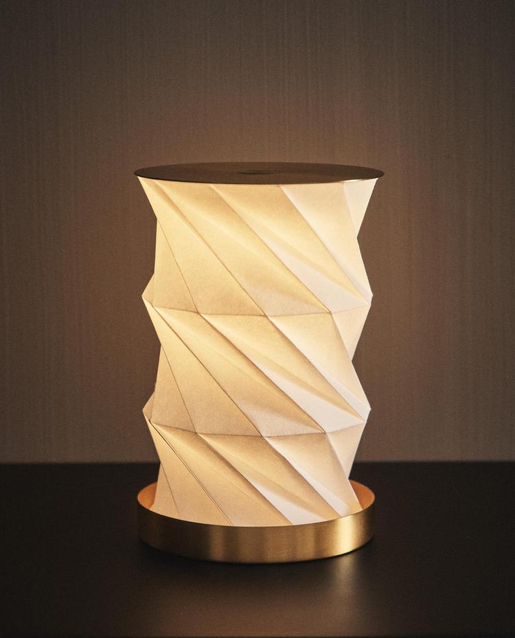 Foldable paper table lamp. Featuring a round metal base and top. Between these two parts, the lamp's body is made of paper, forming a geometric pattern reminiscent of origami. This pattern allows the piece to vary in height. In addition, it offers three lighting options. By pressing the button for a few seconds, the light intensity can be adjusted, allowing the environment to be adapted to your needs and preferences. The lamp is rechargeable via a USB port, making it practical and easy to use anywhere with access to a power source. A full charge provides 6 hours of battery life.