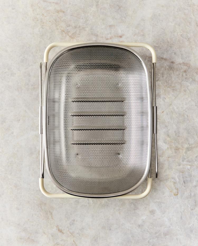 مصفاة معدن بمقابض قابلة للتمديد لتناسب المساحات المختلفة.