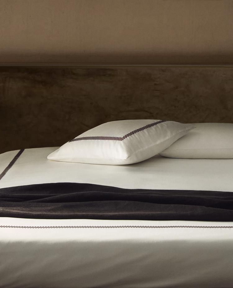 Duvet cover in 300 thread count cotton sateen with an embroidered geometric design.