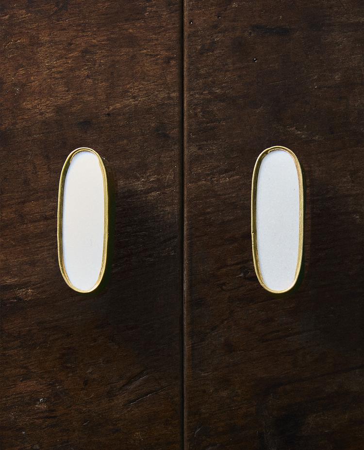 Tiradores tipo pomo para armarios o muebles, elaborados en mármol, con forma ovalada, borde dorado a contraste.