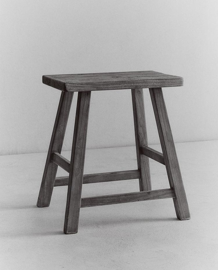 Prostokątny taboret wykonany z drewna wiązowego. Nie wymaga montażu. Ze względu na pochodzenie materiałów, jego kolor może się nieznacznie różnić.